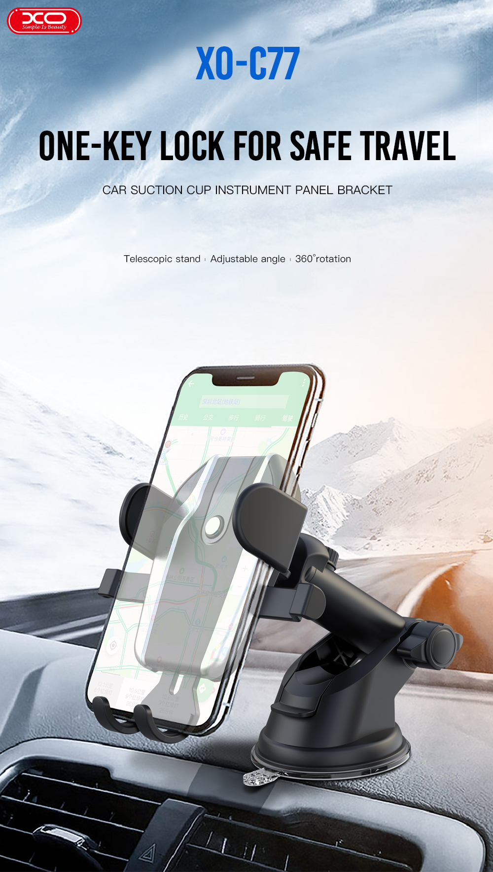 Soporte universal para auto con brazo ajustable y ventosa de alta fijación. Permite rotación 360°, ideal para usar el GPS o atender llamadas con total seguridad. Compatible con la mayoría de celulares.