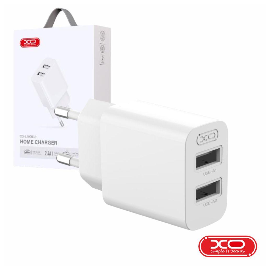 El L109 es un cargador compacto con dos puertos USB-A y salida total de 2.4A, ideal para cargar dos dispositivos a la vez. Ofrece carga rápida y segura, e incluye un cable USB (según versión).